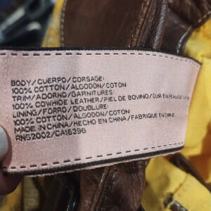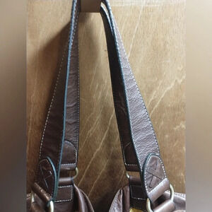 Cotton bag with leather handles. This would have originally come with a scarf that would be fed through the loops on the trim. This bag does not have the scarf. A few small stains on interior exterior in good condition.