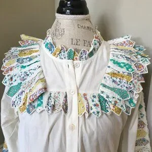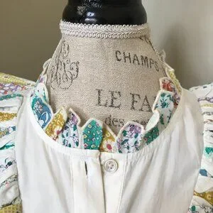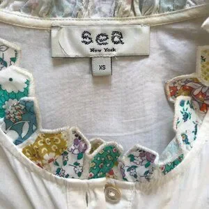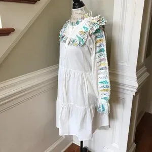 Sea NY Linden Patchwork Dress Womens XS Cream Blue Long Sleeve Ruffle Cotton