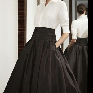 Partnering a shirt-style top with a voluminous ball skirt, this two-tone taffeta gown is the embodiment of simple sophistication.