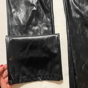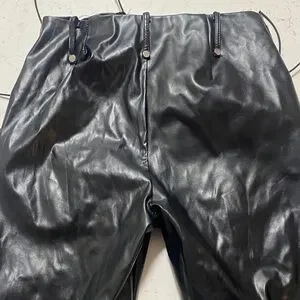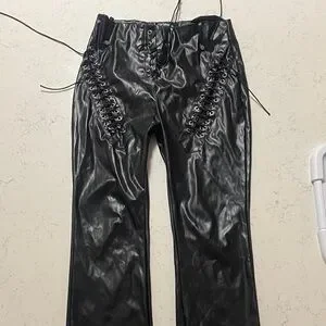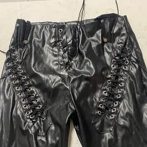 Stylish black leather pants with lace-up details. Perfect for a bold look.