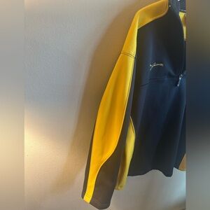 This NASCAR Sporty Dale Jarrett Pullover Has A Quarter Zip, Color Block Black And Yellow, Soft, Warm, Comfortable, Collectors, Racing Fan, Dale Jarrett, NASCAR, UPS Racing, Vintage NASCAR, Pullover, Long Sleeves, Fan Apparel