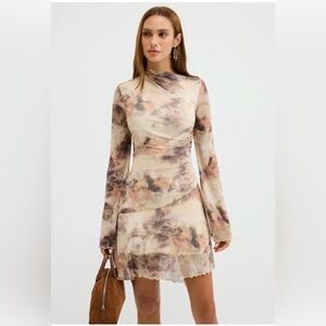 Chic long sleeve dress with tie-dye pattern. Flared sleeve. Mesh fabric. Soft and stylish for any event.