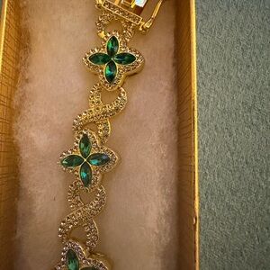 Stunning bracelet with gold accents and green floral designs. Perfect for adding elegance to any outfit.