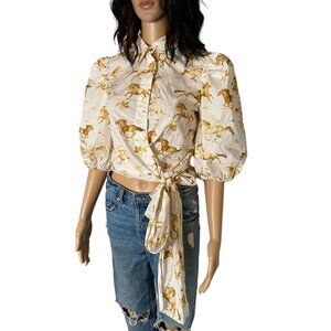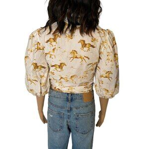 Ganni Weston Horse Print Wrap Blouse Puff Sleeve Button Down White XS