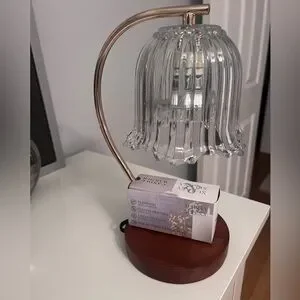 Stylish glass table lamp with a wooden base. Features a clear glass shade and a sleek gold arm.
