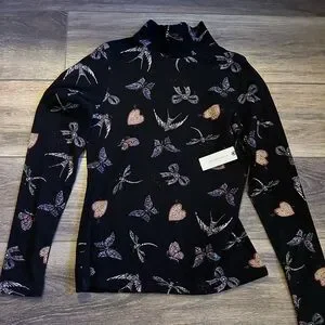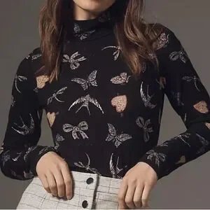 Anthropologie Black Long Sleeve Turtleneck with Butterfly and Hearts by Maeve