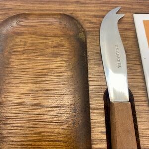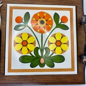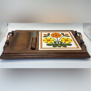 Vintage 70s wooden serving tray w/ ceramic tile and knife