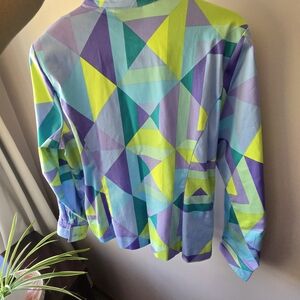 it's a geometric archive piece from the "Wearable Art" collection. The trippy abstract print and neon-pastel palette give off major retro-futurism vibes. Perfect for layering over a baby tee or styling as a bold centerpiece.