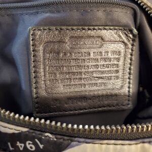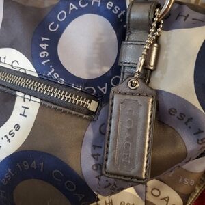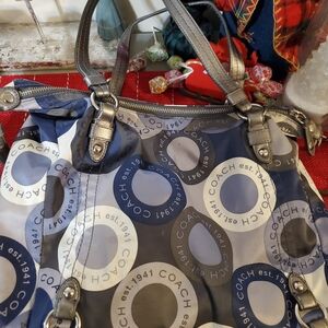 Eye-catching Coach bag with a playful circle design. Features multiple colors for a trendy look. Ideal for everyday use. The Coach Snaphead Print Sateen Alexandra Blue Gray Hand Bag Purse is a vintage Coach satchel/top handle bag. It features a large size with a width of 14 inches and height of 12 inches, with a zip closure and silver hardware accents. The exterior is made of sateen fabric with a blue and gray pattern, and the handle/strap is gray leather. The lining is gray fabric, making this a stylish and practical choice for women's handbags. Authenticity unknown.