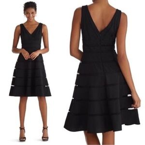 Fit-and-Flare Dress with a flattering nipped waist and horizontal banding with sheer mesh insets.