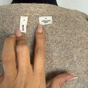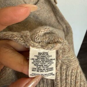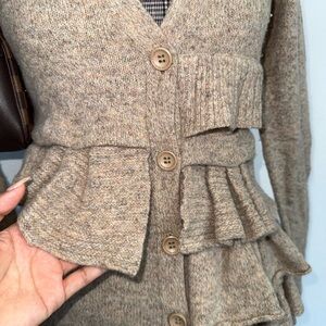 This beautifully crafted wool-blend cardigan is the perfect blend of cozy comfort and feminine charm. Featuring a soft neutral taupe / oatmeal tone, this sweater is elevated by its unique layered ruffle peplum design, creating a flattering, waist-defining silhouette that feels both romantic and timeless.
