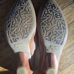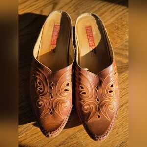 Elegant brown leather mules with intricate cut-out design. Comfortable slip-on style. Perfect for casual wear.
