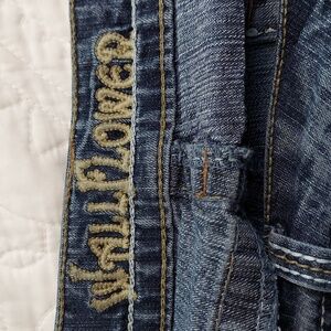 These Wallflower jeans boast a chic capri, ankle-length design in a classic blue shade, perfect for casual outings. The medium wash and subtle fading offer a relaxed, worn-in look. With a comfortable fit and rolled hems, they are a versatile addition to any wardrobe.