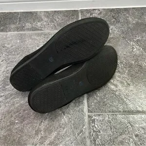 Sleek black flats with a modern design. Perfect for everyday wear. Comfortable.