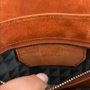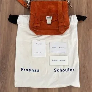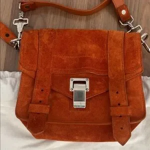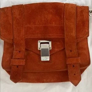 Mini suede Ps1 bag by Proenza Schouler. Features a rich rust colour. Hardware is in great shape, lots of discolouration to suede as pictured, mainly concentrated on back of bag (from dark jeans :( but hidden when worn.)