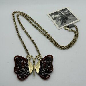 Vintage Anthropologie Butterfly Pendant Necklace Brown Filigree Wings Gold-Tone