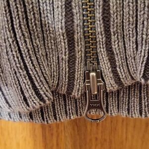 Chic ribbed cardigan by Sundance. Features a sleek design with a front double zipper and raglan sleeves. Fits more like a medium. No call outs, holes or stains. More brown than gray. Ideal for layering.