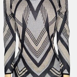 Chic and eye-catching INC International Concepts metallic sweater in size XS. Features a bold chevron geometric pattern in black, silver, and gold with metallic shimmer throughout — perfect for holidays, date night, or girls’ night out. Soft stretch knit fabric provides a flattering, figure-hugging silhouette without feeling tight.