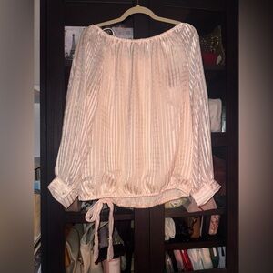 20 1/2" center front length (size Medium) Partially lined Off-the-shoulder neck Long sleeves with one-button cuffs Ties at waist 100% polyester Machine wash, tumble dry Imported