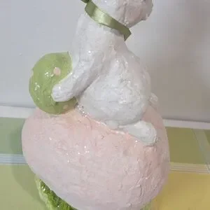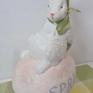 Charming Easter bunny figurine sitting on a pink egg with 'SPRING' text. Features a green bow and base. This is an older piece. Has minor flaws from age. So please expect that when purchasing. Sold as is.