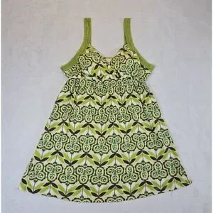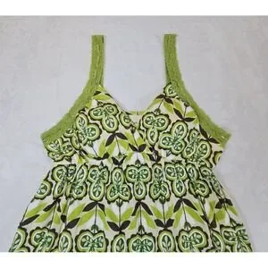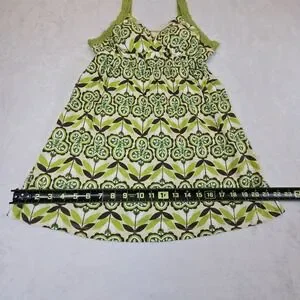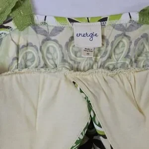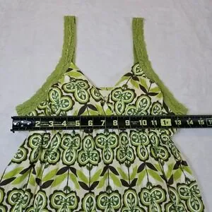 This Vintage Y2K Women's Medium Baby Doll Lace Tank Top in green floral is a perfect addition to any 90s-inspired wardrobe. The V-neckline, sleeveless design, and lightweight fabric make it ideal for casual occasions in the summer, fall, or spring. The backless feature and built-in bra offer comfort and support, while the wide straps add a stylish touch. Made from a blend of cotton and modal, this tank top from the brand Energie is machine washable for easy care. Embrace the Mod, Y2K, and Bella Swan themes with this adorable and unique piece. No pets or smoke.