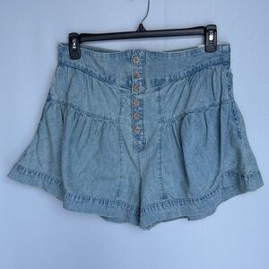 Free People shorts • Fleur denim shorts • Pleated denim shorts • Ultra high rise shorts • Belle blue denim • Boho summer shorts • Button fly shorts • Elastic waist denim • Women’s XL shorts • Festival outfit