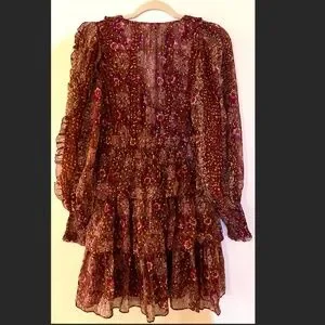 Elegant mini dress with floral pattern. Features long sleeves and a tiered skirt. Perfect for any occasion.