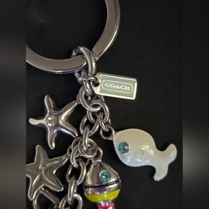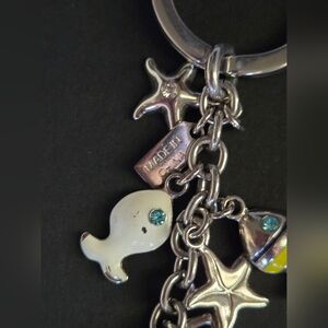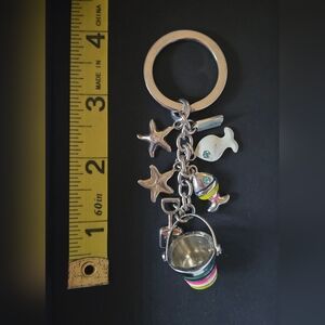 Charming key holder with silver finish. Features colorful accents. Includes starfish, fish, and whale charms.