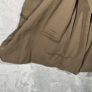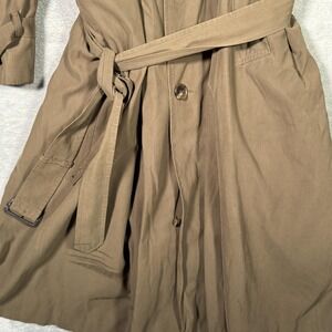 Pre-owned trench coat with general wear, wrinkling, and signs of age. Noticeable dark streak stains on the lower front hem area of the shell. One front button is chipped with frayed stitching at its attachment point. Belt, cuff straps, and remaining buttons and buckles are present and functional; removable wool liner is intact with light surface wear, no holes or tears seen, and no factory hang tags included.