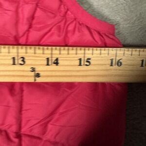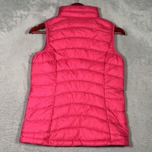 Previously worn girls down vest with light overall wear and wrinkling. Small black mark on the lower front hem as shown in photos. Fabric, insulation, zipper, and pockets are intact and functional; interior tags present, original retail tags not included.