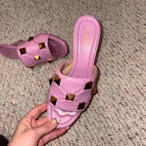 Elegant pink sandal heel with signature gold rockstuds. Perfect for a stylish look, Barbie pink. Size 36.5 fits like a 6. Worn once, sold without box.