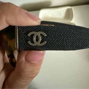 Authentic Chanel sunglasses featuring a chic tortoiseshell cat-eye frame with iconic black fabric (tweed-style) arms and gold-tone CC logo hardware.
