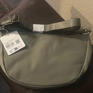 Stylish olive green crossbody bag by Lululemon. Features a sleek design with a front zipper pocket.