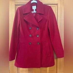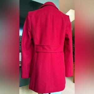 G.H.Bass&Co. timeless double-breasted red wool blend pea coat design. Tortoise shell button closure (extra button). Bold color for standout style. Full lining in tact with no callouts. Silhouette and color perfect for versatile styling. Ideal for cooler days.