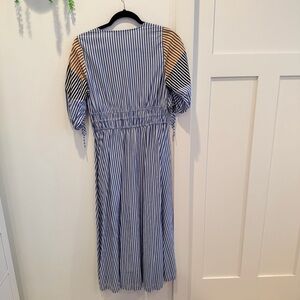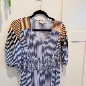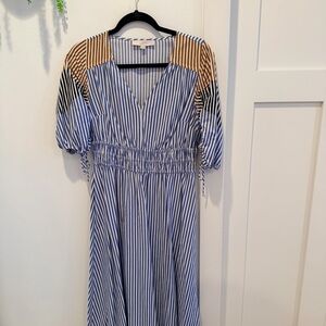 LOFT Striped Midi Dress Tie Puff Sleeve Blue Tan Minimalist Women's Dress MP