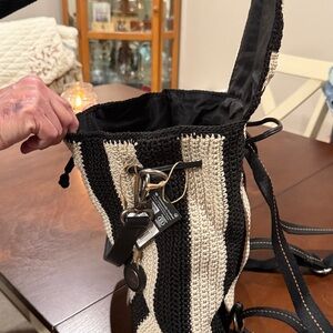 Elevate your style with this chic black and white striped backpack from The Sam. Perfect for any occasion, this bag combines elegance with functionality.