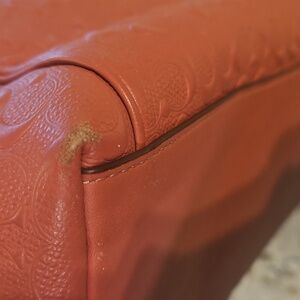 Stylish Coach tote in pink. Features embossed design and chain straps. Perfect for any occasion.