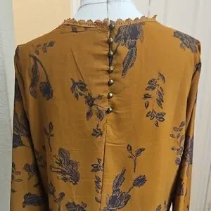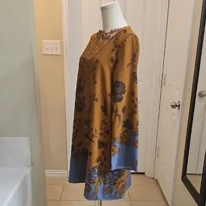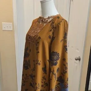 Altar'd State Golden and Blue Floral Long Sleeve Boho Dress with Crotchet Detail