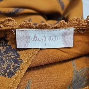 Altar'd State long sleeve shift dress with a golden/mustard base color and blue floral print. It features a lace or crochet detail around the neckline and blue trim on the cuffs and hem. The dress has a bohemian or casual-chic style.