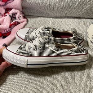 Women’s converse, low top. Black and white striped with burgundy accent. Size 5. Like new. Worn once.