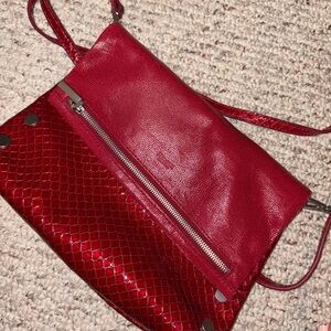 Chic red leather clutch with textured design. Features a sleek zipper detail. Ideal for stylish outings.