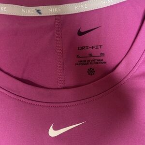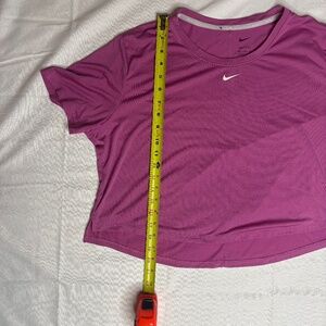 Nike Dri-FIT short sleeve crop t-shirt. Pink colorway. White swoosh logo on chest. Curved hem design. Size XL extra large. Front shoulder to hem measures approximately 18 inches. Back shoulder to hem measures approximately 20 inches. Excellent used condition. Small mark on inner seam not visible when wearing. No other flaws.