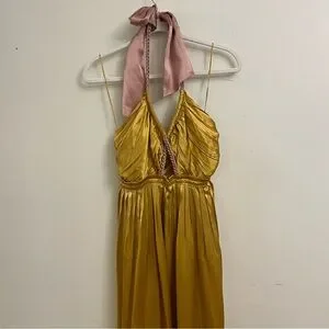 Stunning yellow halter dress featuring a pink tie detail and dark olive green. Great for a vacation or as a summer dress. Never been worn. Still has tags on and in perfect condition.