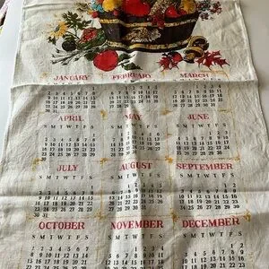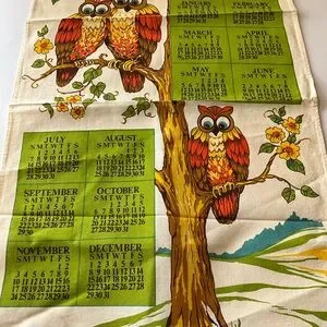 This vintage tea towel calendar features a charming design with owls in a tree, giving thanks for fruits, flowers, and mushrooms. Made of linen with a vibrant orange, yellow, green, and red color palette, this set includes two towels perfect for housewarming or any occasion. The machine washable feature ensures easy care and maintenance, adding a touch of retro style to your kitchen decor from the 1970s and 1985.