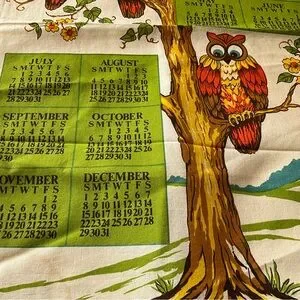 Vtg Tea Towel Calendar Owls In Tree Give Thanks Fruits Flowers Mushrooms