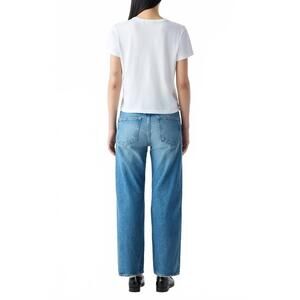 Meet the Robbie Jean by AMO, crafted in a medium wash cotton for a relaxed fit with a subtle flare. These jeans offer a mid-rise style and cropped length, ensuring an effortless look perfect for summer travels. They are made in the US and feature a practical button closure and handy pockets. Care for these versatile jeans with ease by machine washing them.