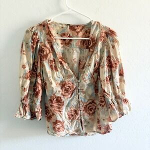 Keywords: Free People, floral blouse, peasant top, bohemian blouse, ruffle sleeve, button down blouse, long sleeve blouse, floral print top, vintage style blouse, boho top, Free People top, medium blouse, brown floral, beige floral, blue floral