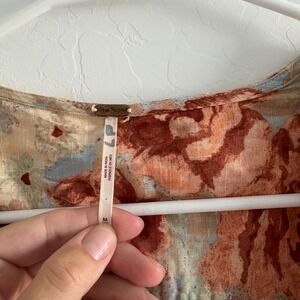 Romantic floral blouse from Free People, perfect for adding a touch of bohemian flair to your wardrobe. This charming top features a flattering V-neckline with a button-down front, allowing you to adjust the coverage to your liking. The long sleeves are finished with delicate ruffle cuffs, adding a feminine touch. The overall floral pattern in shades of brown, beige, and blue creates a vintage-inspired look. The back of the blouse has a cinched elastic waist. Pair this beautiful blouse with jeans for a casual daytime look, or dress it up with a skirt for a special occasion. It's also ideal for a garden party or a weekend brunch.