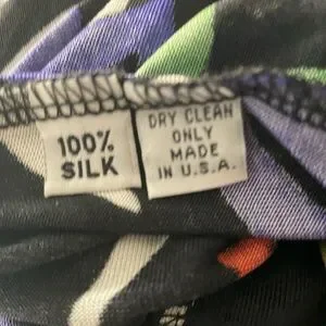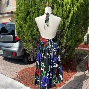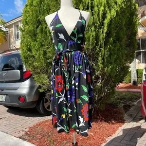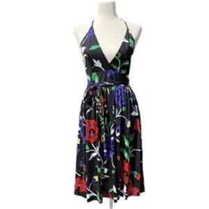 Nieves Lavi Colorful Floral Halter Wrap Dress. 100% silk. Made in USA. Size 6. In good preowned condition, but it does have 2 white streaks which I have not tried to take off toward the bottom of dress as shown in last picture. Otherwise no noted flaws.