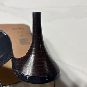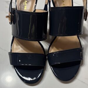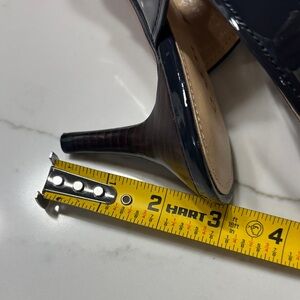 Elegant dark blue heels with a glossy finish. Features a chic strap and gold detail. Perfect for any occasion. Pre owned excellent condition see pictures and video.
